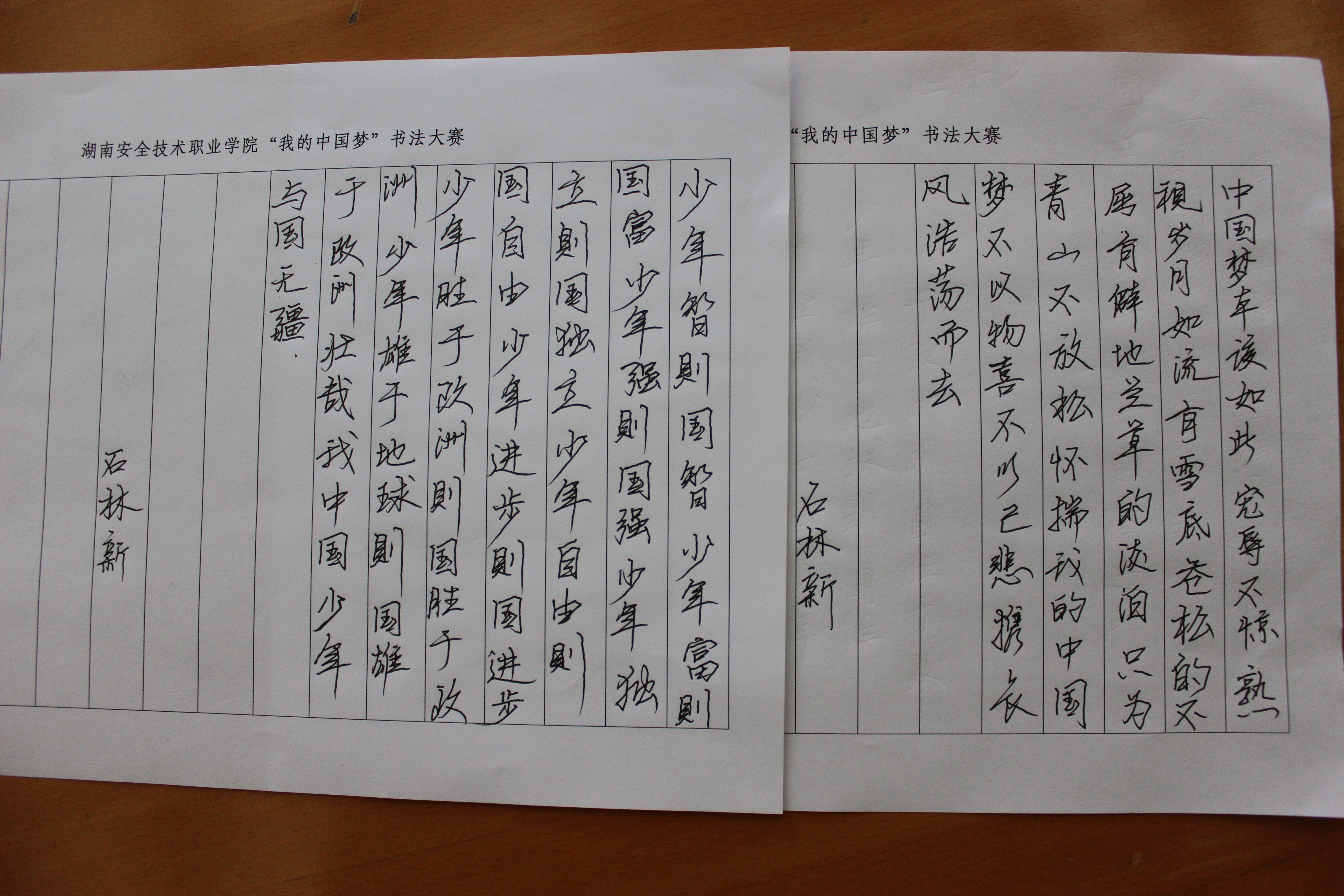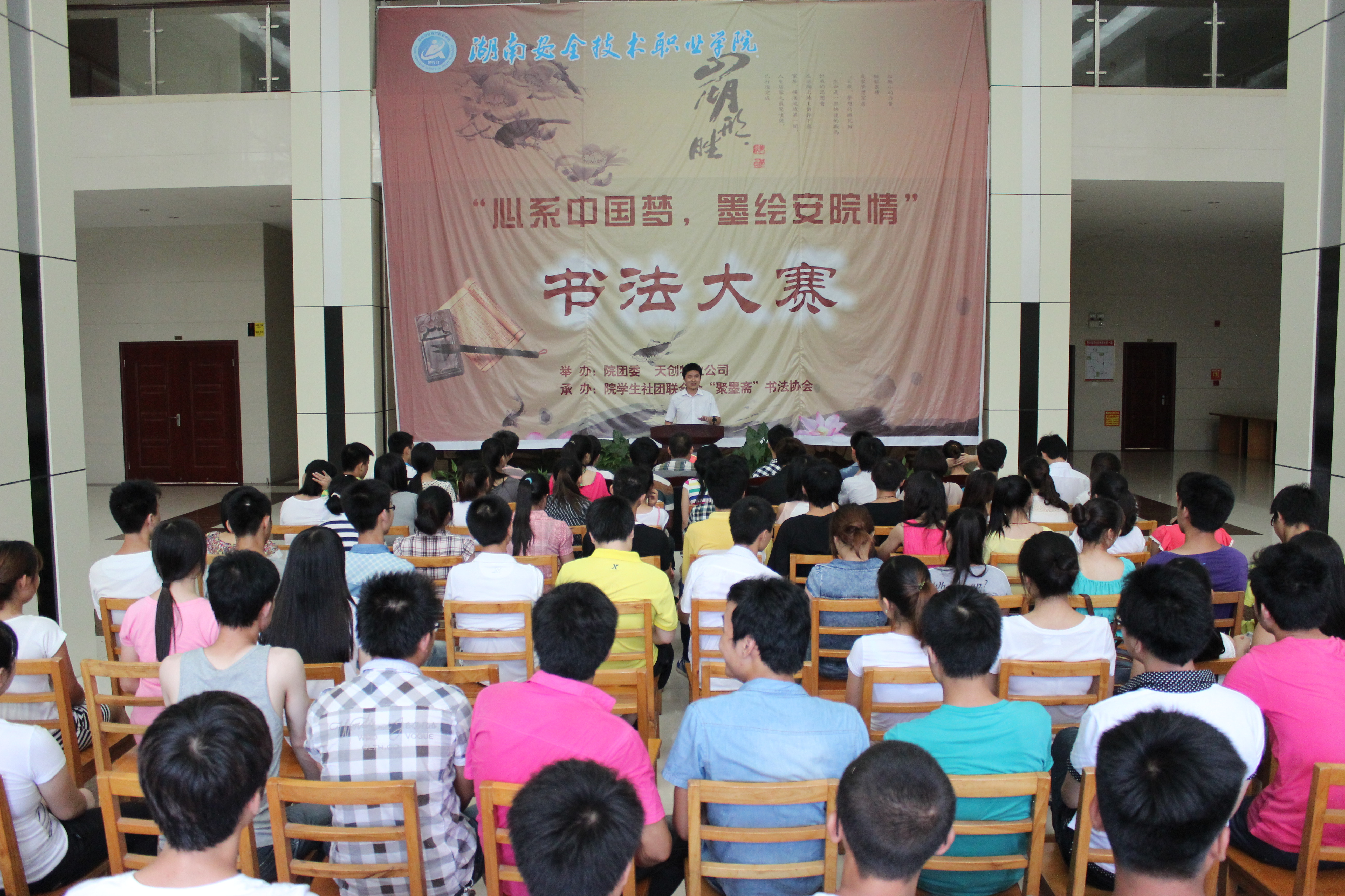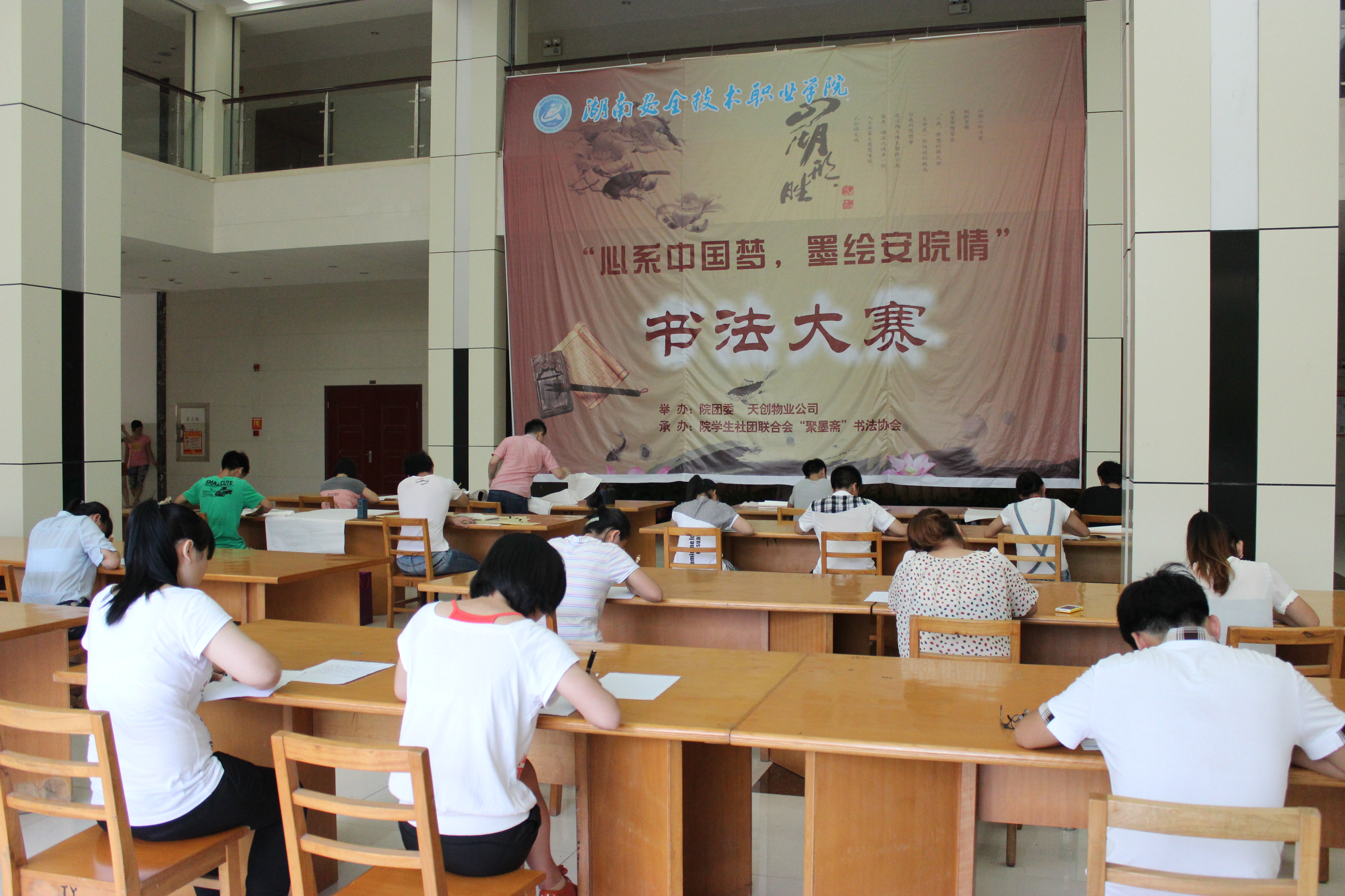 书法是一门学问,更是一门艺术。它不仅是中华民族的文化瑰宝,而且在世界文化艺术宝库中独放异彩。为进一步弘扬中国传统书法艺术,丰富校园文化艺术生活,增强同学们对书法艺术的学习兴趣,提高审美能力,院团委于6月20日下午联合长沙市天创物业管理有限责任公司在图书馆一楼大厅举行了“我的中国梦”书法大赛。