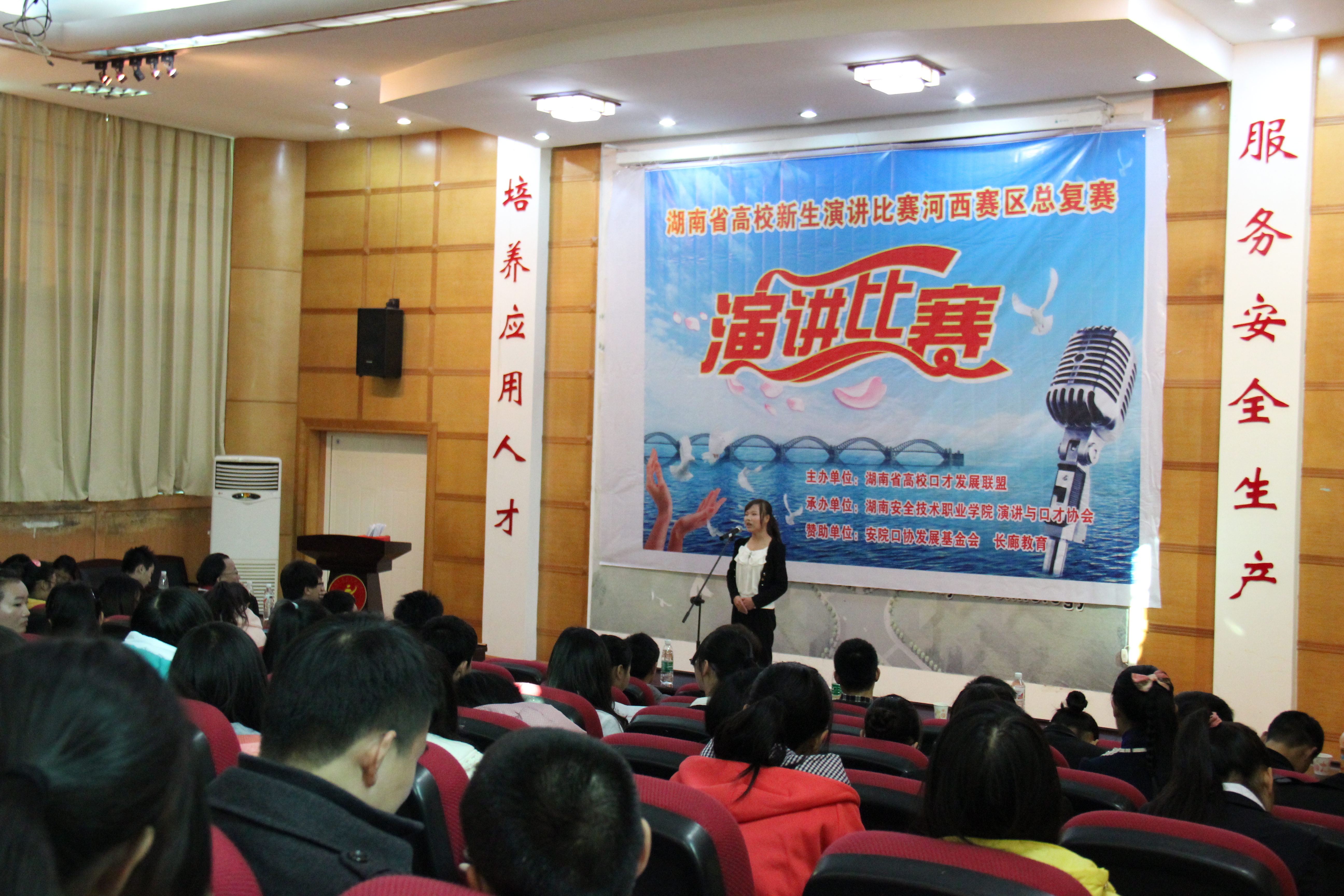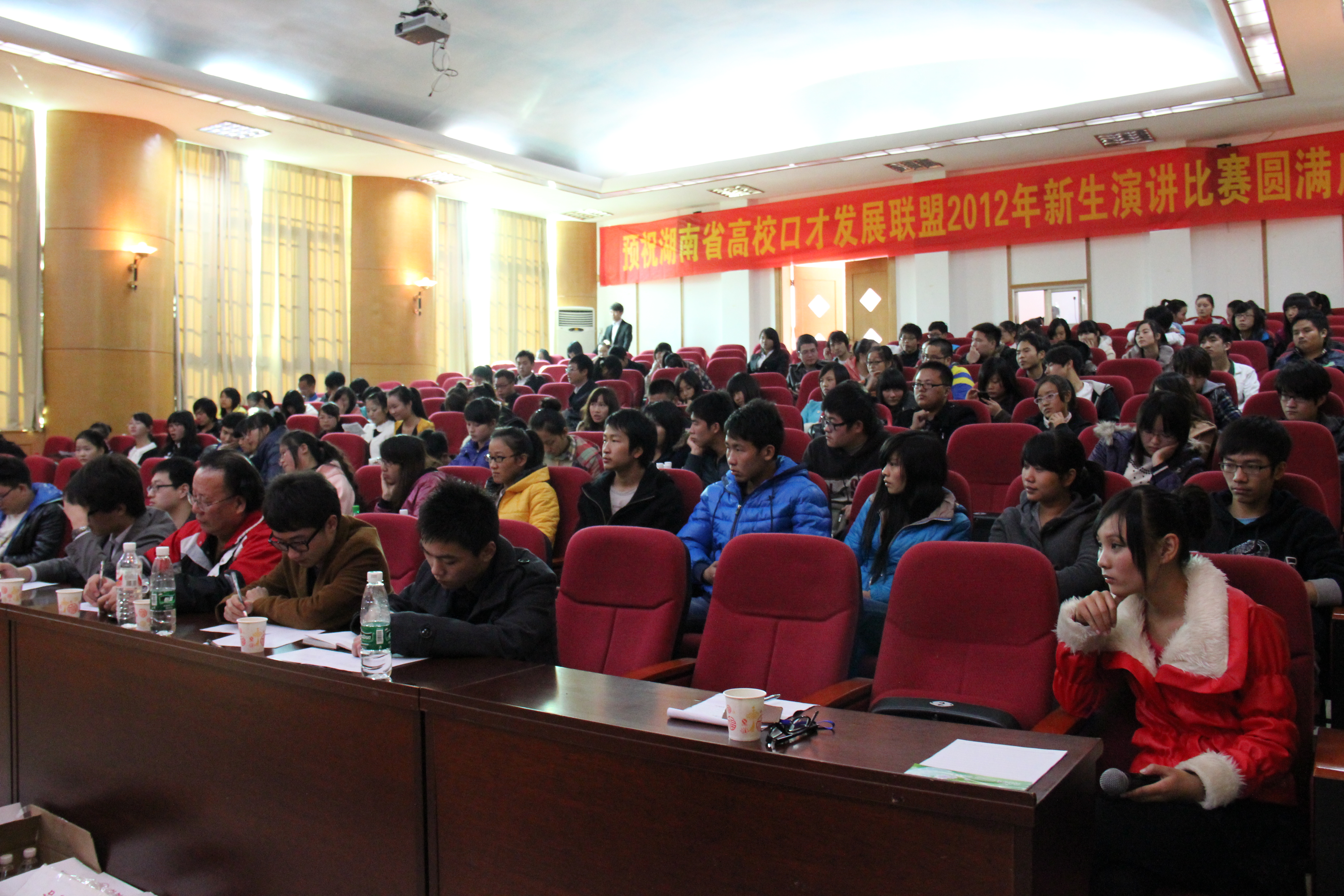 11月17日下午14:00,湖南省高校口才发展联盟2012年新生演讲比赛河西赛区总复赛在我院学术报告厅隆重开赛。本次比赛以“国学经典”为主题,由省高校口才发展联盟和我院团委共同举办,我院演讲与口才协会承办。来自湖南大学、中南大学、湖南师范大学和我院共计12所高校的22名口才精英参加了本次比赛。