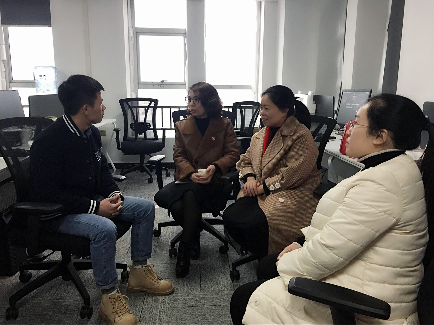 随后罗主任一行走访看望了在联软科技公司就职的2017届毕业生彭建建,罗主任仔细询问了彭建建的工作和生活情况,对他的工作给予了充分肯定,并希望他继续努力,取得更大发展。