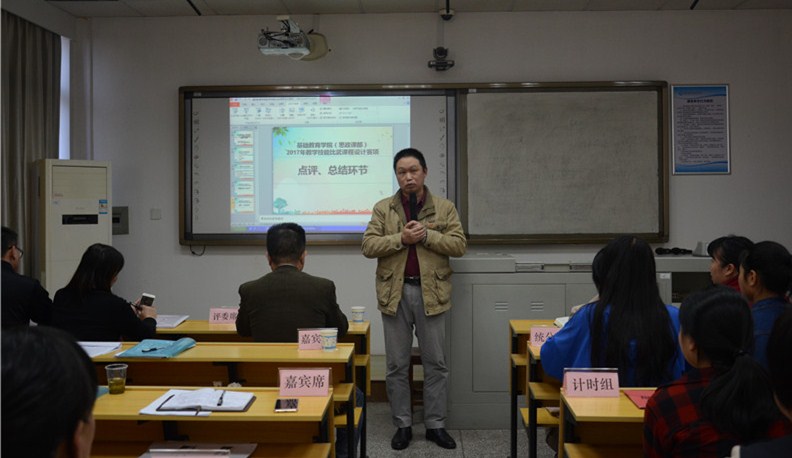 赛后,院领导曾大恒代表评委组作赛后点评。他强调,值党的十九大召开之际,开展此次比武活动,不仅是适应了发展的需求,用实际行动给十九大献礼,而且也是响应教育部倡导的“课堂革命”、贯彻落 实学院(中心)第一次党大会目标的务实之举,比赛很有必要也很有意义。他指出,活动组织很好,教师参与度实现了全覆盖,充分说明了基础教育学院对此次比赛的重视,充分说明学院教师是一支能战斗的团队,他希望全体教师以此为契机,加大对课程改革力度,顺应时代发展趋势,以时不我待的精气去践行“课堂革命”。周劲松也对比赛提出了宝贵意见,他认为此次比赛组织得力,教师参与高,充分赛出了教师各自能力和水平,他同时指出参赛教师要注意比赛指标体系,调整说课结构,优化呈现方式,要注意教师说课、指标体系、呈现方式三者和谐。