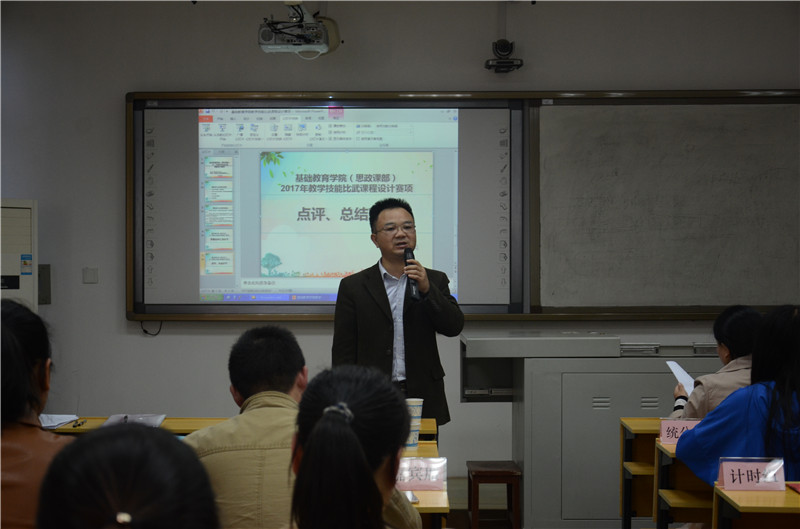 2017年10月20日下午,基础教育学院(思政课部)在知行楼210举办2017年教师课程设计比武大赛(初赛),学院13位专任教师参加此次比武。学校(中心)党委书记李海涛、副院长周劲松受邀出席并观摩比赛,曾大恒、黎鑫、杨娇、肖毅志、刘瑛、夏旭等6位校内特邀评委全程参与比赛,学院党政负责人及教职工全程观摩。比赛由基础教育学院学工办负责人黄金玉主持。