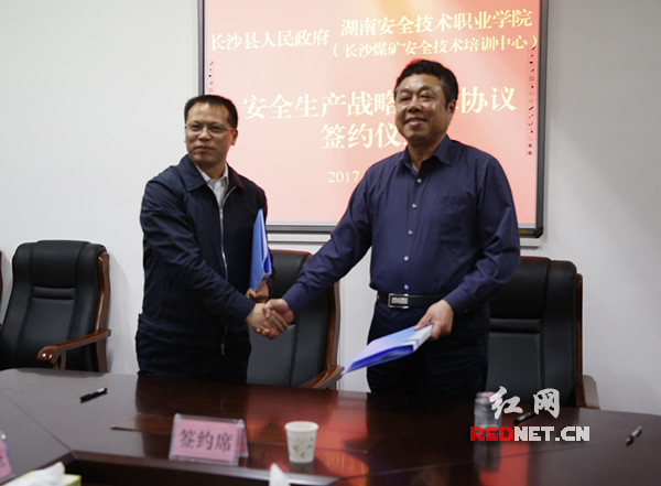 湖南安全技术职业学院院长郭超(右)与长沙县委常委、常务副县长王国良(左)分别代表学院和长沙县政府签约。