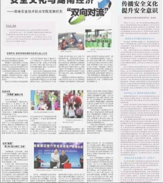 8月19日,省委机关报、我省主流媒体《湖南日报》以整版方式报道我院发展情况。标题为《安全文化与湖南经济双向对流》,突出反映了我院在安全生产人才培养、培训、技术服务等方面取得的丰硕成果,介绍我院大力弘扬和培育安全文化,引导安全理念,夯实安全生产基础,提高支撑保障能力和服务水平,促进我省安全生产工作。并发表了学院、中心党委书记李海涛同志的署名文章《传播安全文化,提升安全意识》,介绍了学院大力弘扬安全文化大事记。